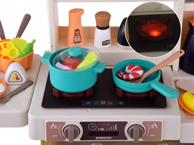 Ruotando la manopola, le piastre si illuminano, si sentono i suoni di cottura e da un bruciatore, dopo aver aggiunto l’acqua, si alza un vapore sicuro. Un’esperienza realistica che i bambini adorano.