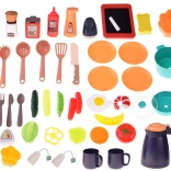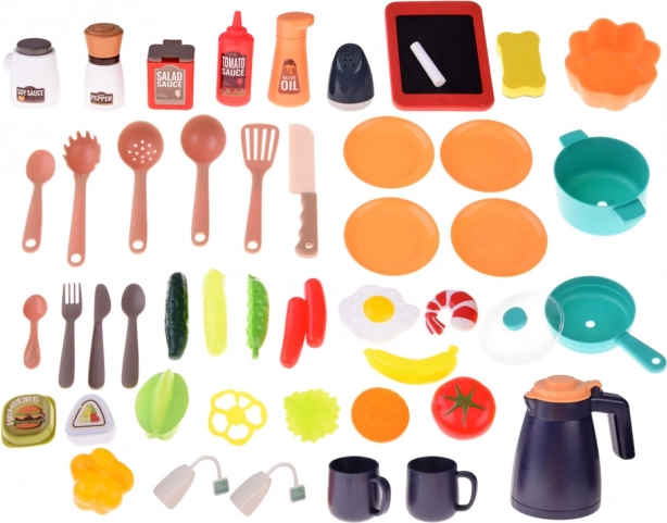 Grazie al set di 49 accessori, i bambini possono facilmente preparare il “menu del giorno”: dalle verdure e uova, al sushi e hamburger, fino ai condimenti. Non mancano pentola con coperchio, padella, utensili, piatti, tazze e una mini lavagna per scrivere con il gesso. La struttura è resistente e sicura, realizzata in plastica di qualità con attenzione ai dettagli.