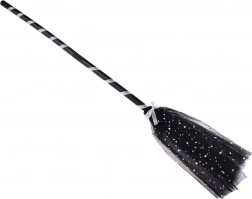 Scopa pieghevole con motivo a spirale nero e bianco e frange decorative che aggiungono un tocco giocoso al costume.