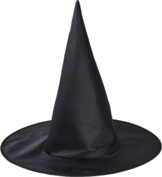 Tradizionale cappello da strega nero con punta alta e ampia tesa per completare un costume autentico.