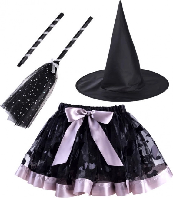 Cappello nero a punta, gonna vaporosa con elastico, scopa pieghevole