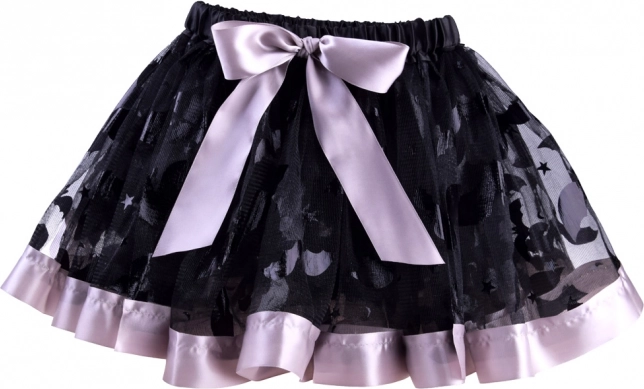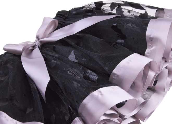 Gonna nera in tulle con motivi decorativi, bordo viola e fiocco. La vita elastica garantisce comfort e facilita la vestizione.