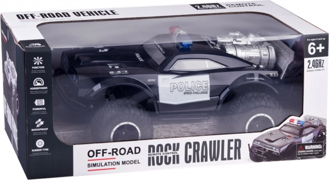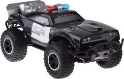 Il set include il monster truck della polizia, il telecomando a 2,4 GHz, una batteria da 500mAh 7,4V e un caricatore USB.