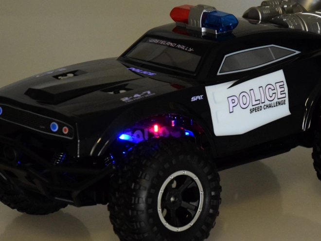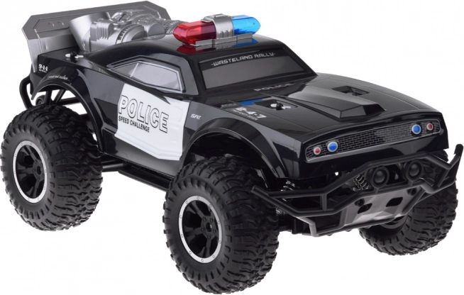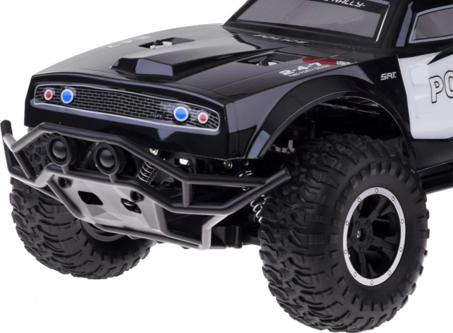 Il monster truck è caratterizzato da un design robusto con elementi distintivi della polizia, inclusi luci rosse e blu e la scritta POLICE.