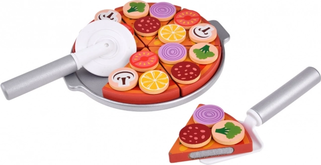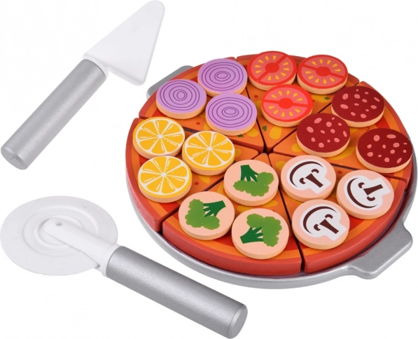 Questo set pizza in legno offre ai bambini la possibilità di diventare chef nella propria pizzeria. Con 27 pezzi in legno, inclusi diversi accessori colorati, i bambini possono creare e servire la pizza secondo la loro fantasia. I pezzi di pizza sono collegati con velcro, permettendo un facile taglio e riassemblaggio.