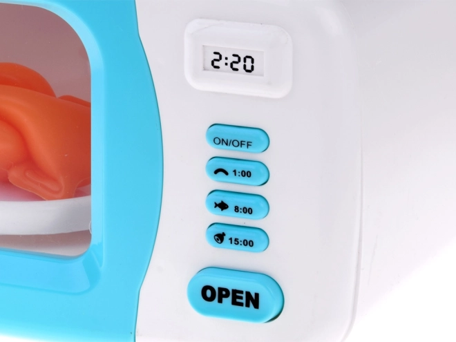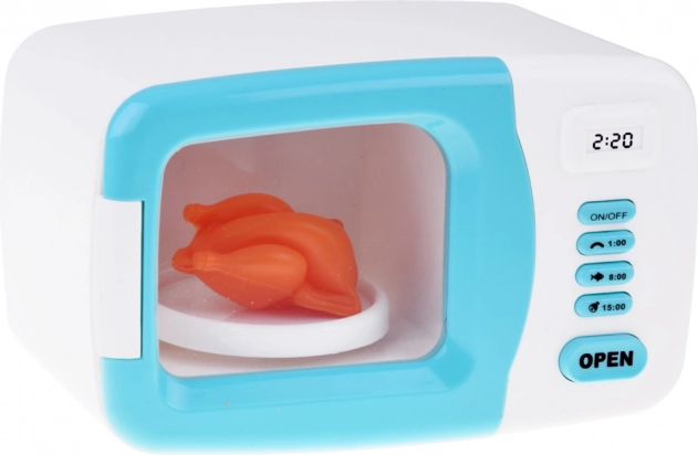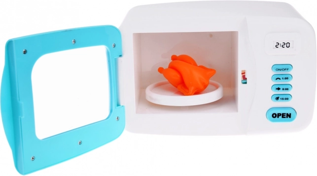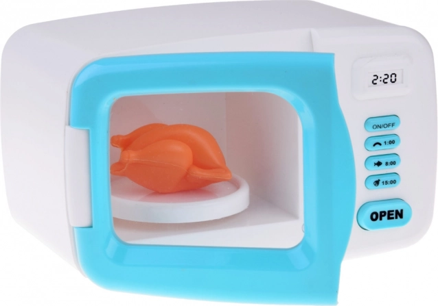All'interno del forno a microonde c'è un modello di plastica di un pollo che si gira sul piatto quando acceso. L'interno del forno è illuminato da una luce rossa durante l'operazione simulata, aggiungendo autenticità all'esperienza. Questo prodotto stimola la fantasia dei bambini e incoraggia l'interesse per la cucina e la preparazione dei piatti.
