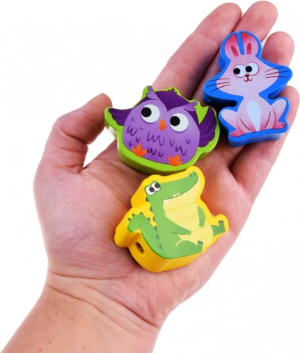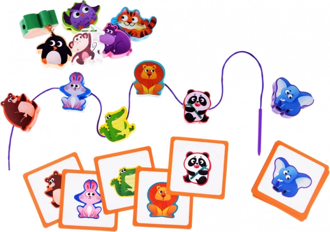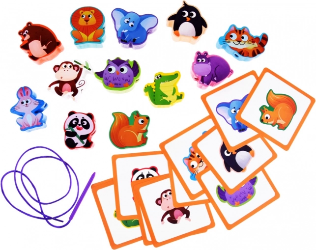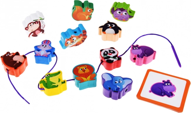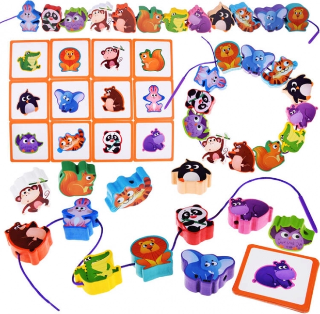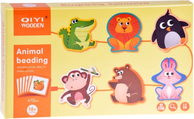 - Include 12 blocchi a forma di animali che i bambini possono infilare con un cordino, migliorando così la loro concentrazione e le abilità motorie.
