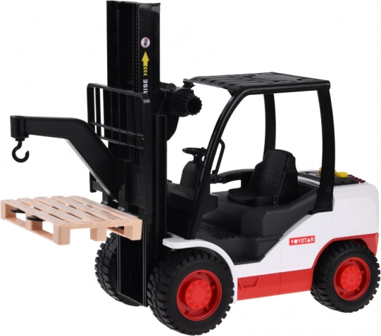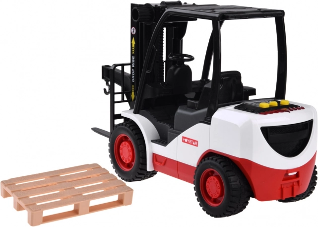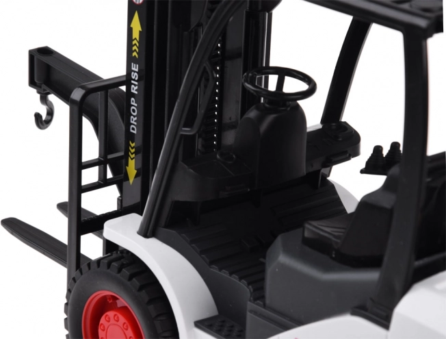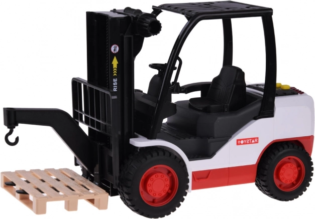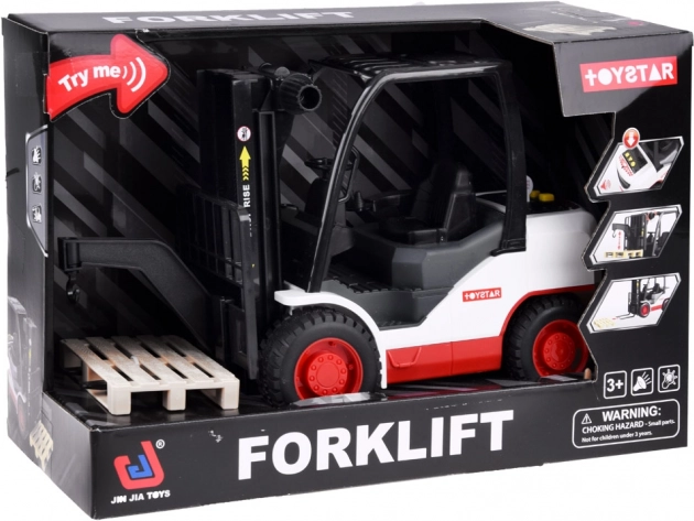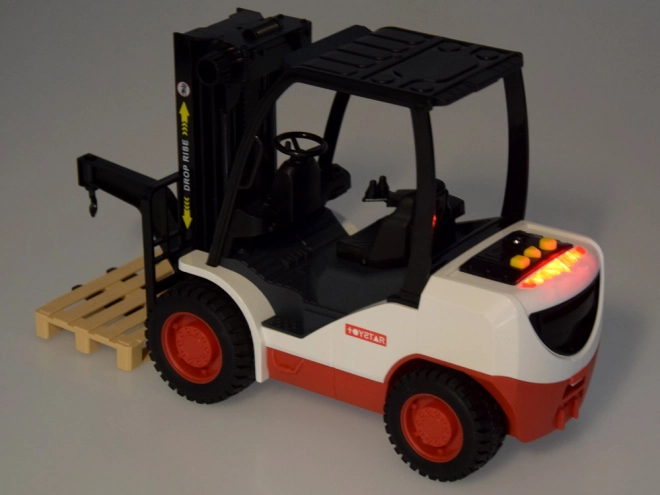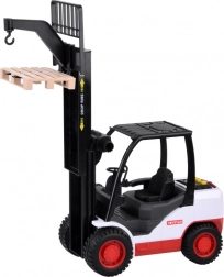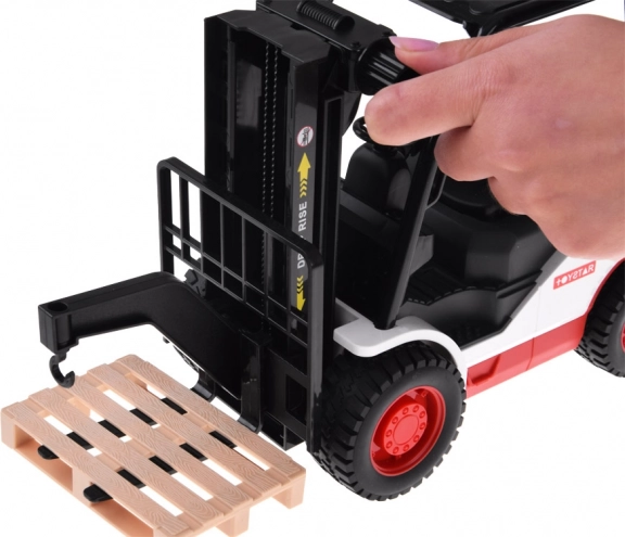 Il carrello elevatore è realizzato in plastica di alta qualità ed è progettato per sembrare una macchina reale. Ha una trasmissione a frizione che permette di muoversi su superfici lisce. Include vari effetti sonori, come l'accensione del motore, suono di lavoro e suono di retromarcia.