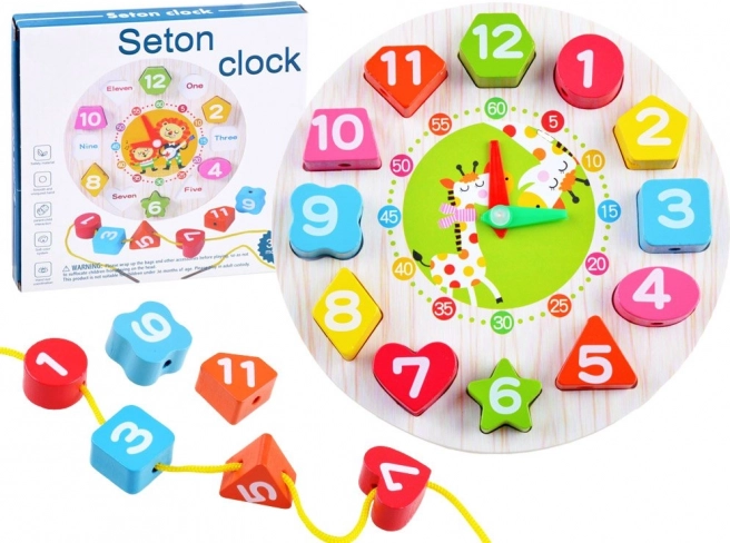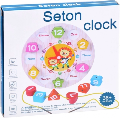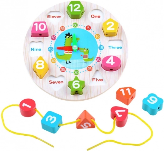 Base in legno con orologio, numeri/forme da inserire, lancette mobili, cordoncino per infilare (a seconda della variante)