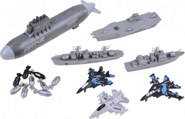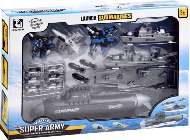 Scopri un set di gioco d’azione per piccoli strateghi: sottomarino, portaerei, nave di rifornimento, cacciatorpediniere, 3 caccia e 15 bombe per missioni navali senza fine. Realizzato in plastica resistente, con dettagli realistici e trazione posteriore del sottomarino per un gioco ancora più divertente in mare e in aria.