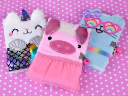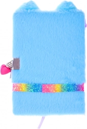 Diario in peluche con design elegante del viso di un gatto blu con occhiali da sole arcobaleno e fiocco viola. Perfetto per registrare i segreti grazie alla serratura con chiave.