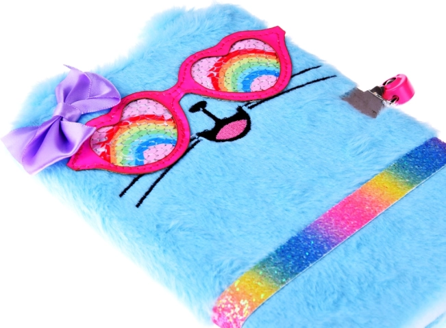 Copertina blu in peluche con dettagli ricamati che ricordano un gatto. Occhiali con lenti a forma di cuore, paillette arcobaleno e fiocco viola aggiungono un tocco di colore.