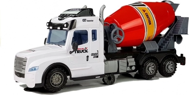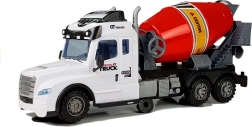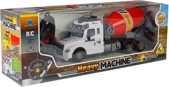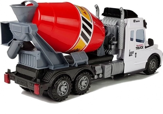 .Veicolo da costruzione radiocomandato per bambini è dotato di ruote in plastica con battistrada, che consentono il gioco su diverse superfici. La betoniera bianca con tamburo rosso è decorata con dettagli neri a contrasto e adesivi vistosi.