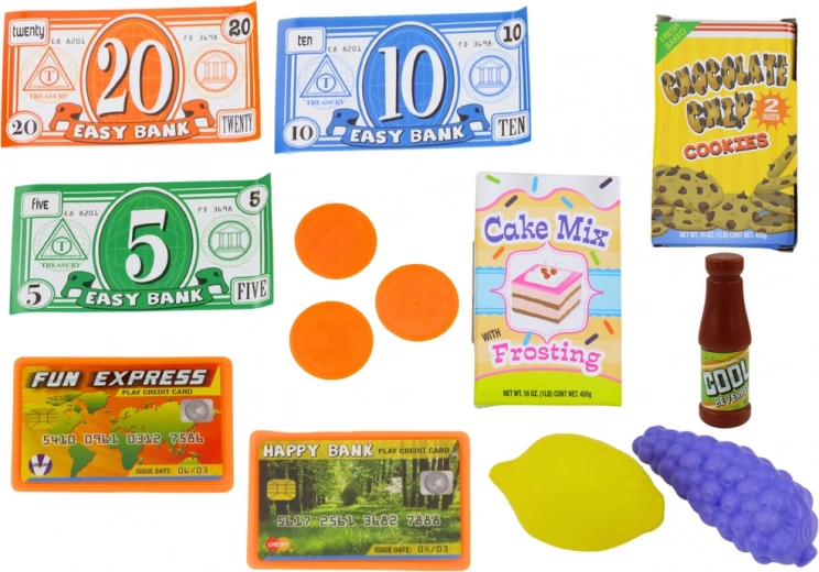 Il set comprende denaro da gioco, banconote, monete e carte di pagamento, una grande opportunità per imparare a contare il denaro e sviluppare abilità interpersonali attraverso la simulazione di interazioni commerciali.