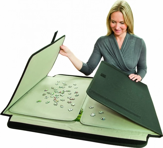 Nella confezione sono inclusi due tappetini separati per ordinare e appoggiare i pezzi. Le chiusure in velcro garantiscono un fissaggio stabile, evitando spostamenti durante il trasporto. La cartella è adatta a puzzle fino a circa 68 × 49 cm (500–1000 pezzi).