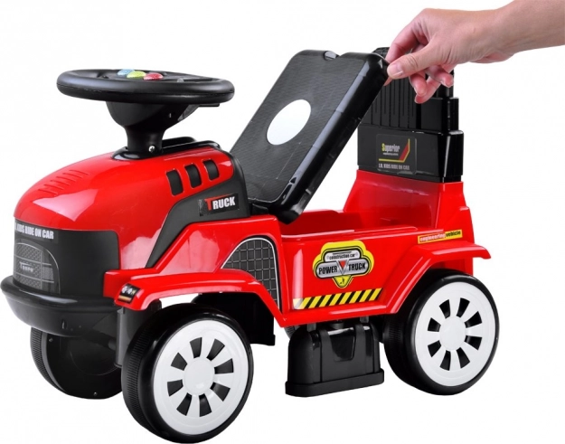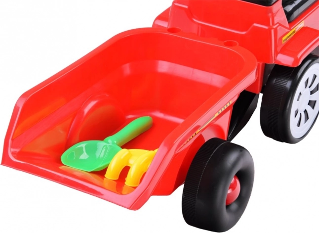 Il rimorchio si collega facilmente e presenta fori per riporre gli attrezzi inclusi – paletta e rastrellino. Sotto il sedile si trova un pratico nascondiglio per piccoli tesori. Le ruote anteriori girevoli facilitano la guida e favoriscono lo sviluppo della motricità e della fantasia durante il gioco.