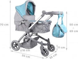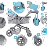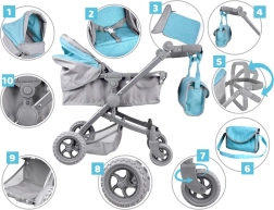 La dotazione pratica comprende capottina richiudibile, maniglione regolabile e morbidamente imbottito, cinture di sicurezza per la bambola, ampio cestello inferiore e borsetta rimovibile coordinata per gli indispensabili. Le ruote piene in EVA sono silenziose e facili da mantenere.
