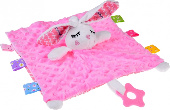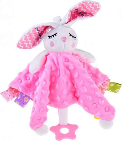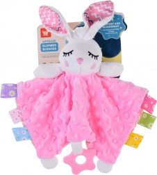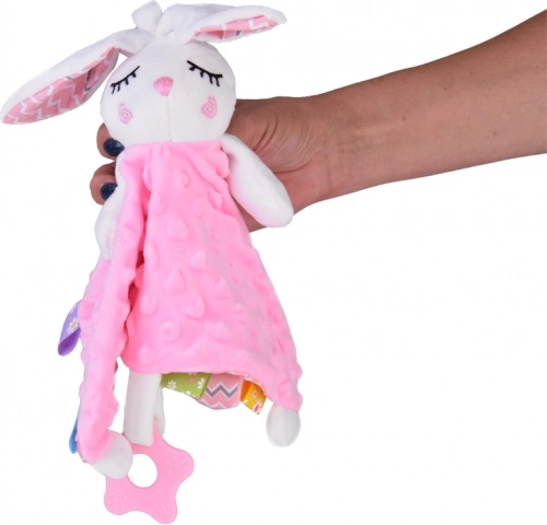 Adorabile copertina peluche a forma di coniglietto con copertina morbidissima, etichette colorate e massaggiagengive in silicone che dona al bebè calma e sicurezza. Favorisce lo sviluppo sensoriale, offre texture diverse, elementi fruscianti e con sonaglino ed è ideale per culla, passeggino e seggiolino auto.