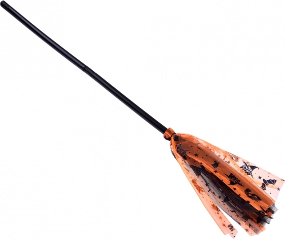 La scopa con manico in plastica e frange in tessuto nei colori arancione e nero completa il costume, ideale per giochi e foto.