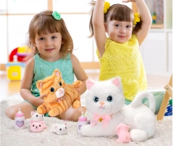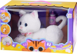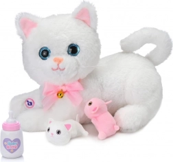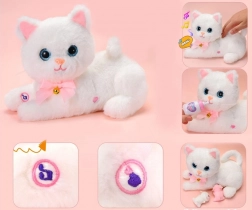 La gatta interattiva bianca è la compagna perfetta per i piccoli amanti degli animali. Ha grandi occhi azzurri, un fiocchetto rosa con campanellino e un peluche soffice che invita alle coccole. Nella pancia nasconde due piccoli gattini e nella confezione è incluso anche un biberon rosa per il gioco dell'allattamento.