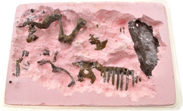 - Blocco da scavo in gesso, pennello, scalpello, martelletto con raschietto, parti dello scheletro, base