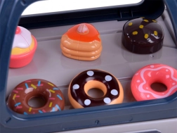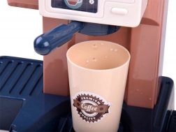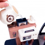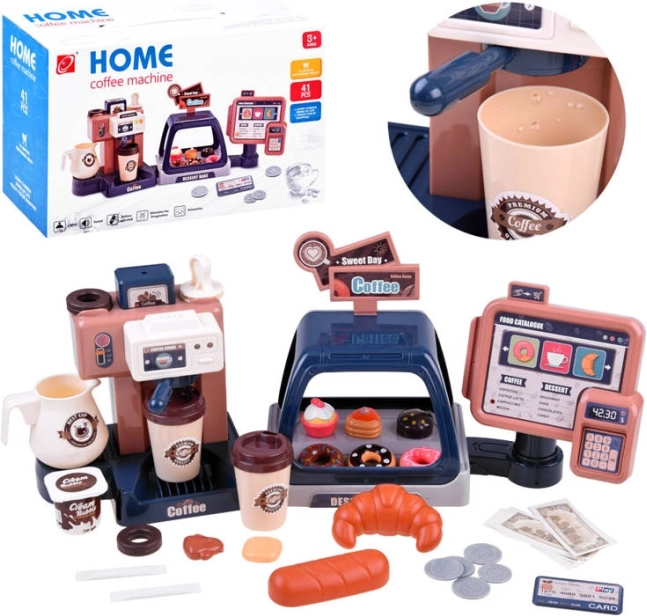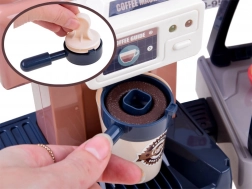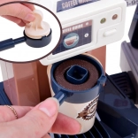 Questo set realistico permette ai bambini di aprire la propria caffetteria: prepareranno “espresso”, esporranno i dolci in vetrina e registreranno l’ordine alla cassa. La macchina del caffè con flusso d’acqua, dopo aver versato l’acqua dall’alto e inserito il portafiltro, “prepara” il caffè con segnalazione luminosa (rosso durante la preparazione, verde a fine ciclo) e suoni di macinatura e versamento. La cassa ha un pannello girevole, emette un bip al pagamento con carta e riproduce il suono di apertura.
