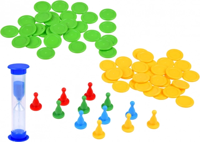 Regole del gioco:La partita inizia assemblando il tabellone al centro dell’area di gioco. Le carte vengono poi distribuite tra i giocatori in base al numero dei partecipanti: 2 persone - 8 carte ciascuno, 3 persone - 6 carte ciascuno, 4 persone - 5 carte ciascuno. Le carte restano coperte, senza guardarle. Ogni giocatore riceve 3 pedine per segnare gli elementi trovati e si stabilisce la persona che distribuirà i gettoni alla fine di ogni round.
