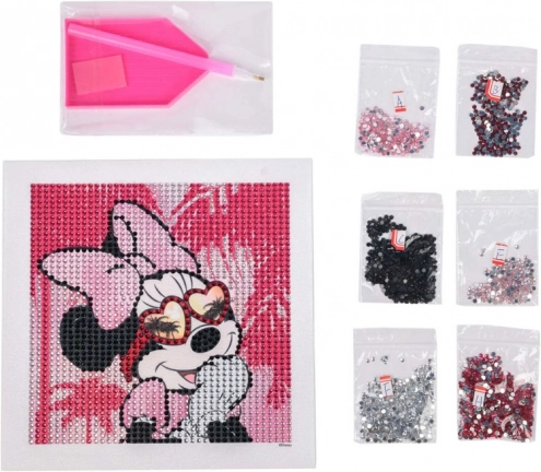 Crea facilmente e con divertimento un'immagine scintillante di Minnie Mouse usando i cristalli e gli strumenti inclusi.