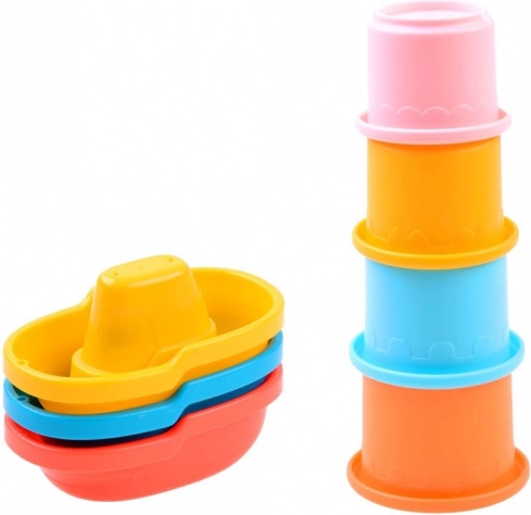Costruisci, travasa e gareggia. I bicchierini impilabili con fori e le tre barchette galleggianti stimolano l’immaginazione e divertenti esperimenti con l’acqua.