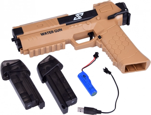 La batteria integrata 3,7 V / 500 mAh si ricarica tramite cavo USB (incluso). I due serbatoi intercambiabili prolungano il gioco senza rabbocchi frequenti. Ideale per il giardino, la piscina e la spiaggia – divertimento sicuro, attivo e rinfrescante per tutta la famiglia. Prima del primo utilizzo, carica la batteria.