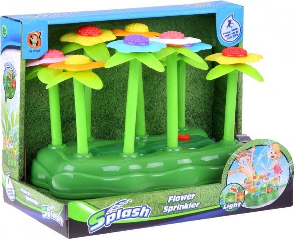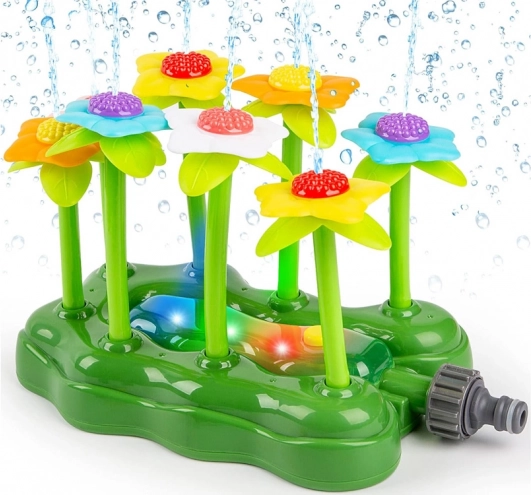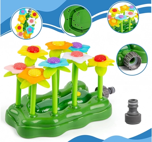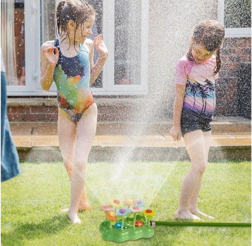 I fiori colorati si ondulano con il flusso d’acqua e spruzzano in tutte le direzioni: perfetti per i giochi estivi sul prato.
