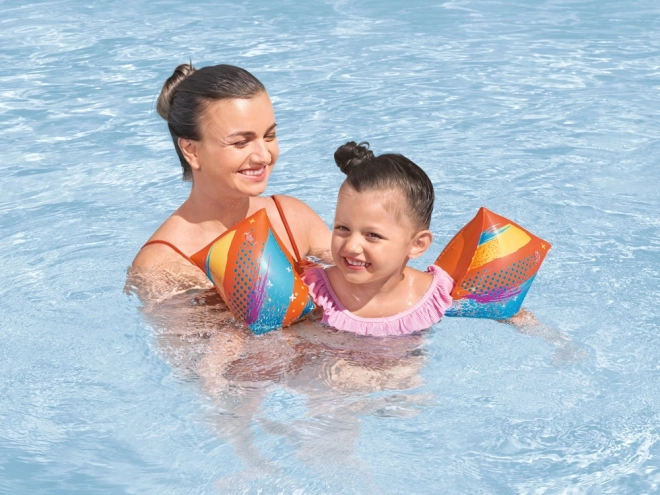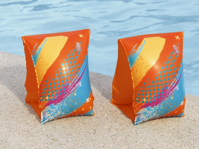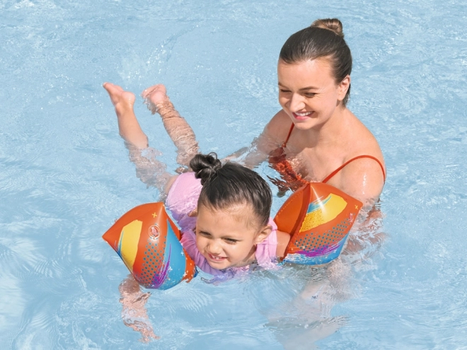 La sicurezza è garantita da due camere separate con valvole che mantengono una galleggiabilità stabile. L'arancione vivace con grafiche giocose aumenta la visibilità del bambino anche nelle piscine affollate. Ideali per un intervallo di peso di 19–30 kg.