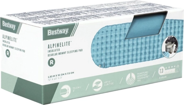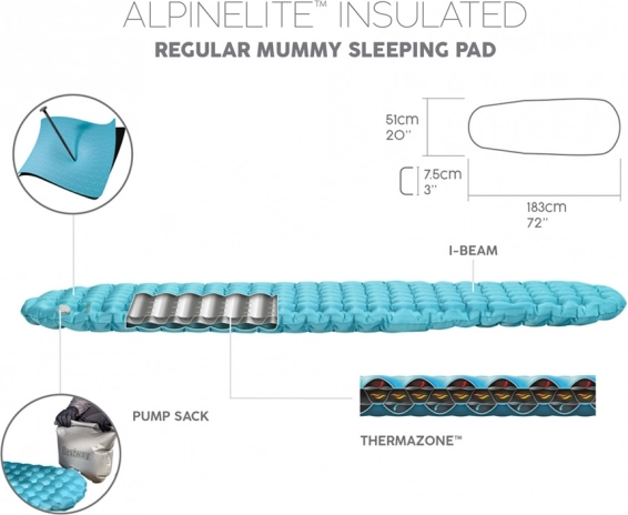 Il materassino AlpineLite Insulated Regular Mummy è la scelta ideale per chi desidera comfort durante il relax in spiaggia, in campeggio o per pernottamenti in tenda all’aperto. Il gonfiaggio è semplice e veloce grazie all’innovativo sistema AirCinch™, basta premere con i palmi sulla sacca e il materassino si riempie rapidamente d’aria. Il set è completo, quindi non dovrai preoccuparti di dimenticare la pompetta.