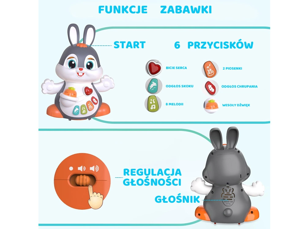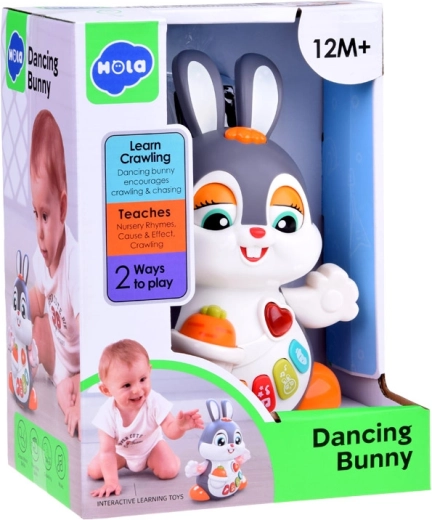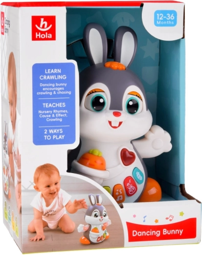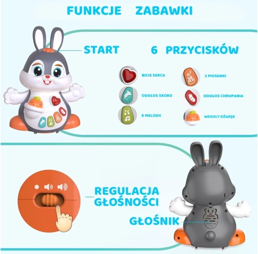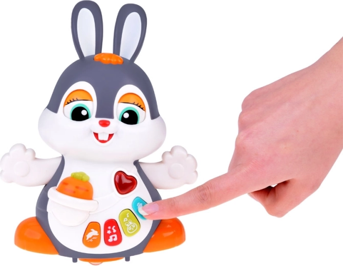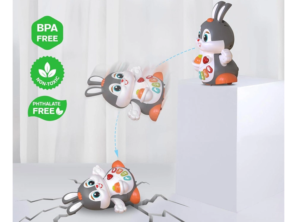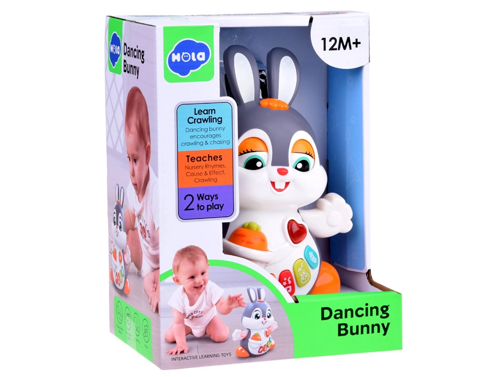 Il coniglietto interattivo danzante è un ottimo compagno per i primi passi e per il gattonamento. Il giocattolo si muove, ammicca e si illumina a ritmo di musica. I bambini saranno attratti dai pulsanti colorati con funzioni diverse: melodie, battito del cuore, suoni dei saltelli o dello sgranocchiare la carota – tutto accompagnato da effetti luminosi.