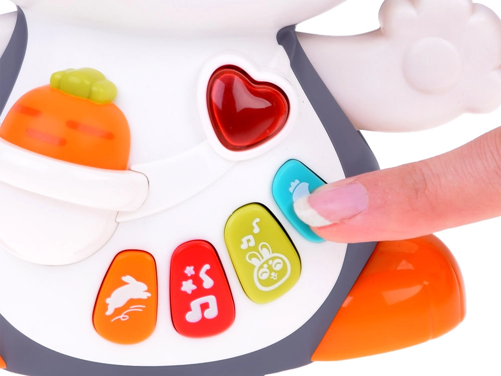 I pulsanti colorati attivano diverse melodie e suoni (battito del cuore, saltelli, sgranocchiare la carota), accompagnati da lucine lampeggianti – ideali per la stimolazione sensoriale.