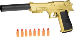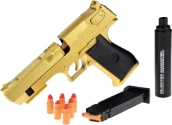 Vivi l'emozione del mondo d'azione con questo Desert Eagle d'oro giocattolo, che spara proiettili di gommapiuma. È dotato di un design realistico e di un silenziatore affascinante per un divertimento ancora maggiore.