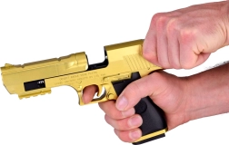 Il giocattolo è progettato per sembrare un'arma vera con incisioni dettagliate e finitura dorata metallica.