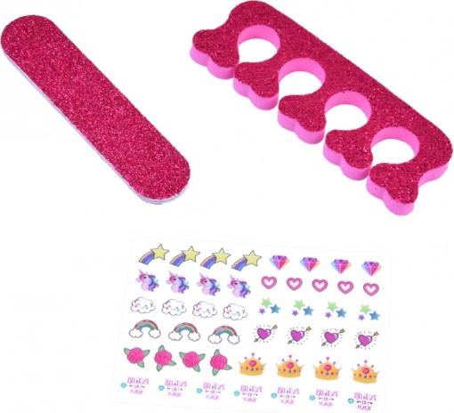 Accessori aggiuntivi: Il set include anche altri accessori per arricchire il gioco, come specchietto, pettine, adesivi per unghie e separatori.