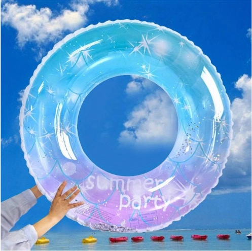 Salvagente trasparente con gradiente blu‑rosa e glitter “summer party”: brilla in piscina e in spiaggia e farà felici tutti i bambini.