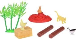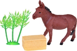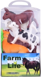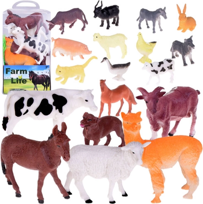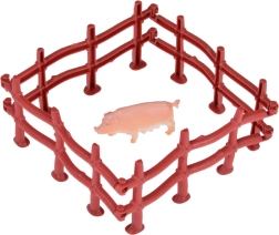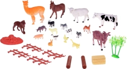 Mucca, cavallo, cane, asino, pecora con agnello, capre, alpaca, maiale, bufalo, gatto, coniglio, anatra e gallina completati da recinzione, balla di fieno, tronchi, cespuglio e base di gioco.