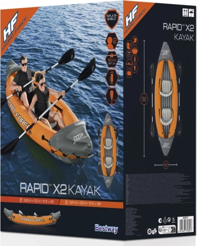 L'Hydro-Force Lite-Rapid X2 è un kayak di struttura robusta che, grazie alle sue dimensioni di 321 x 88 cm, può ospitare facilmente due persone. Il kayak è dotato di sedili gonfiabili con schienali e di una struttura a travi a I per maggiore stabilità e comfort. Le valvole Boston garantiscono un rapido gonfiaggio e sgonfiaggio. Il kayak è inoltre dotato di una pinna rimovibile che migliora la stabilità direzionale e la manovrabilità. Realizzato in materiale PVC resistente, il kayak resiste facilmente ai venti laterali e offre un'esperienza di pagaiata piacevole.