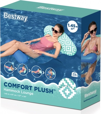 Bestway Comfort Plush è un'amaca galleggiante elegante e confortevole che combina una superficie setosa con una rete traspirante. L'area di sdraio CoolDown mantiene il corpo appena sotto la superficie, così anche con il caldo rimani piacevolmente rinfrescato. A contatto con l'acqua, i colori del motivo risaltano ancora di più.