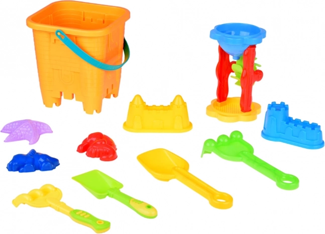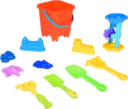 - 1× secchio a forma di castello, 5× formine (2× castello, stella marina, dinosauro, cavalluccio marino), 2× palette, 2× rastrelli, 1× mulino