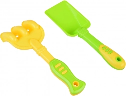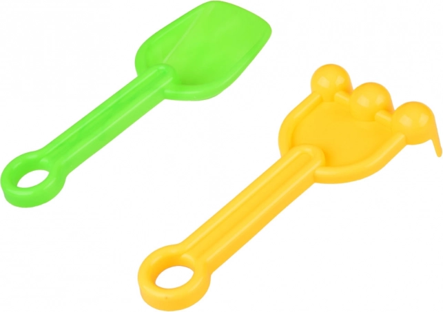 - Dotazione completa: 2 palette, 2 rastrelli, 5 formine (2× castello, rosetta/stella marina, dinosauro, cavalluccio marino) e mulino.