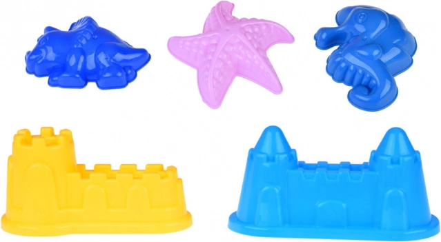 Cinque formine (castelli, stella marina, dinosauro, cavalluccio marino) e un set di palette e rastrelli permettono di creare costruzioni varie e dettagliate.