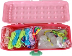Questo set creativo per piccoli designer trasforma ogni momento in un divertente laboratorio di gioielli. L'elegante astuccio rosa funge sia da ordinata organizzazione dei materiali sia da pratica base di lavoro: i pioli in plastica e gli elastici permettono di intrecciare facilmente e creare braccialetti di stile secondo l'umore.