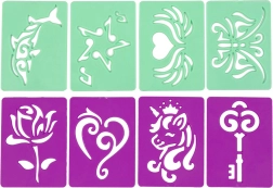 Set creativo per bambini che permette di realizzare tatuaggi temporanei colorati e facilmente lavabili. Include una penna elettronica, 6 pennarelli sicuri e 8 stencil per decorare la pelle in modo rapido e divertente. Scelta perfetta per le feste e per sviluppare creatività, precisione e pazienza.
