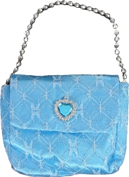 Elegantissima borsetta blu con un motivo argento chic e decorazioni a forma di cuore. Perfetta per occasioni informali e formali.