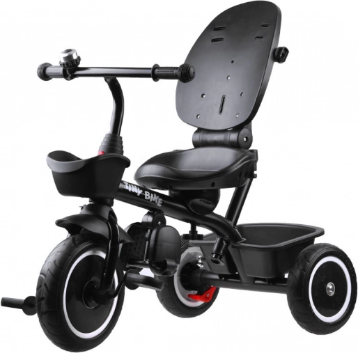 I genitori apprezzeranno la barra di spinta regolabile con impugnatura comoda, i doppi freni di stazionamento sulle ruote posteriori e i pratici spazi portaoggetti: cestino anteriore, ampio cestino posteriore e piccola borsa per gli accessori. Le ruote in schiuma EVA non richiedono gonfiaggio e offrono una guida silenziosa e stabile. Le pedanine ribaltabili e i pedali sulla ruota anteriore facilitano il passaggio tra le modalità, così il triciclo cresce senza problemi con il bambino.