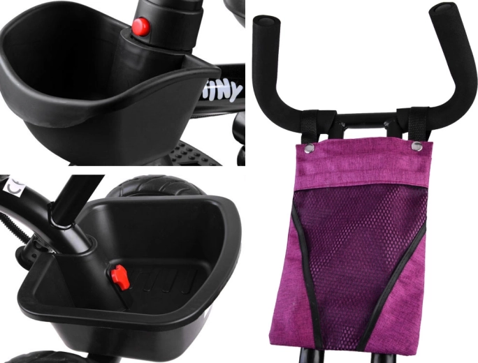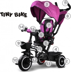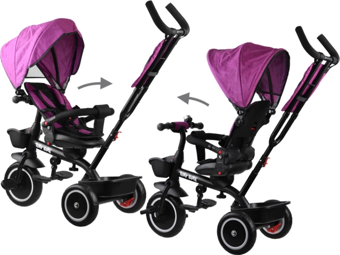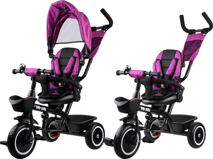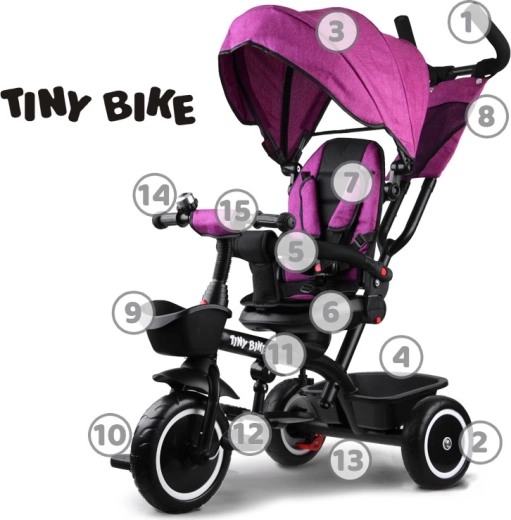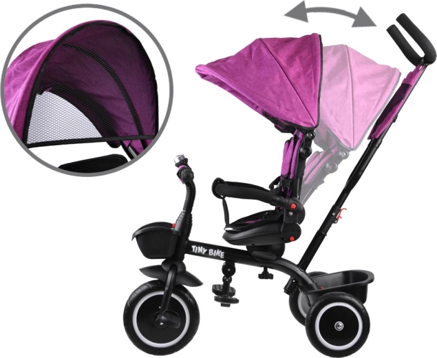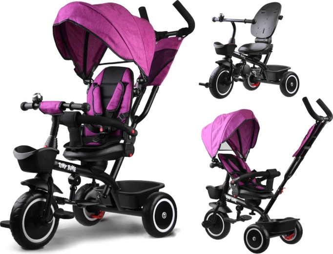 Pratico triciclo 3 in 1 TINY BIKE con sedile girevole e cappottina parasole, cresce con il tuo bambino dai 6 mesi ai 5 anni. Offre comfort, cinture a 5 punti, cappottina pieghevole con rete, guida genitoriale e ruote EVA senza manutenzione per passeggiate sicure e fluide.